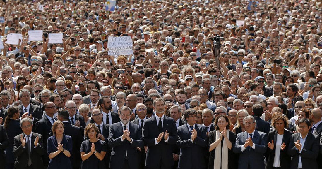 Madrid/Barcelona/Ciudad de México, 18 de agosto (SinEmbargo/ElDiario.es/AP/EFE).- Unidad contra los ataques terroristas en la plaza Catalunya. Las máximas autoridades políticas y miles de ciudadanos han guardado este mediodía un minuto de silencio de duelo por los atentados de este jueves, que ha sido roto con gritos de "no tenim por" (no tenemos miedo). Esa ha sido la frase con la que la ciudad ha querido mostrar su estado de ánimo al mundo, con una multitudinaria concentración que la policía ha cifrado en 100 mil personas.