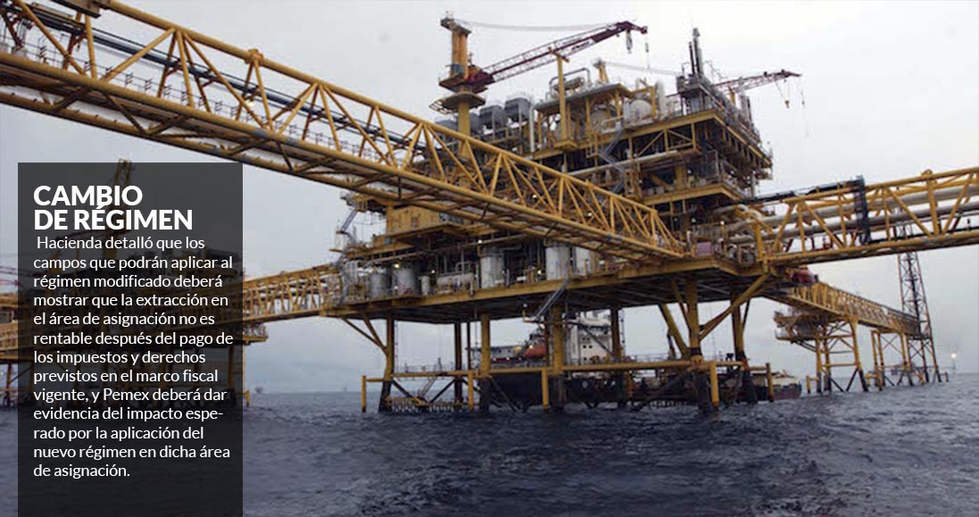 Hacienda detalló que los campos que podrán aplicar al régimen modificado deberá mostrar que la extracción en el área de asignación no es rentable después del pago de los impuestos y derechos previstos en el marco fiscal vigente, y Pemex deberá dar evidencia del impacto esperado por la aplicación del nuevo régimen en dicha área de asignación.