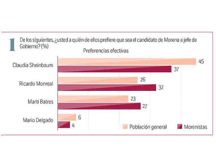 De acuerdo con el ejercicio demoscópico, Sheinbaum alcanza 45 por ciento de las preferencias efectivas del electorado en general, en tanto Ricardo Monreal y Martí Batres disputan la segunda posición con 26 por ciento y 23 por ciento, respectivamente. Mario Delgado alcanza sólo 6 por ciento. Entre simpatizantes de Morena, la contienda es más cerrada, pues la actual jefa delegacional de Tlalpan obtiene 37 por ciento contra 32 por ciento para Monreal, 27 por ciento para Batres y 4 por ciento para Delgado.