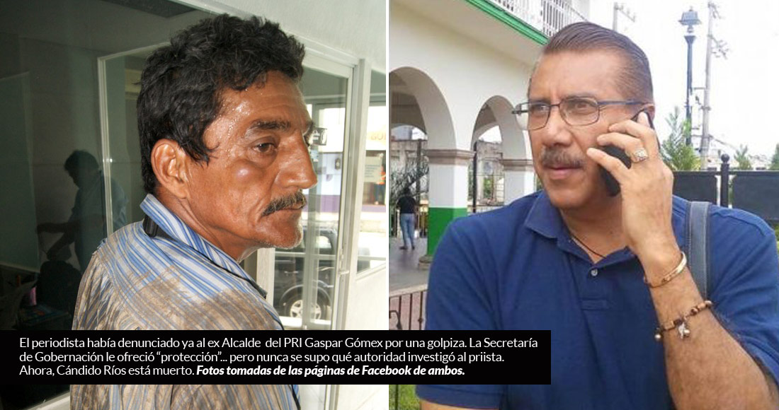 La familia de Cándido Ríos Vázquez rechaza las versiones oficiales de que la muerte del periodista fue daño colateral, como afirmó Roberto Campa, Subsecretario de Derechos Humanos de la Segob. Exigen que en investigaciones aborden amenazas de muerte enviadas por el ex Alcalde de Hueyapan de Ocampo, quien se incomodaba con sus notas periodísticas. En varias ocasiones, siendo Presidente Municipal, Gaspar Gómez lo mandó golpear, a detener y a encerrar en las mazmorras; la última, lo hicieron caminar sobre espinas y lo dejaron lisiado.