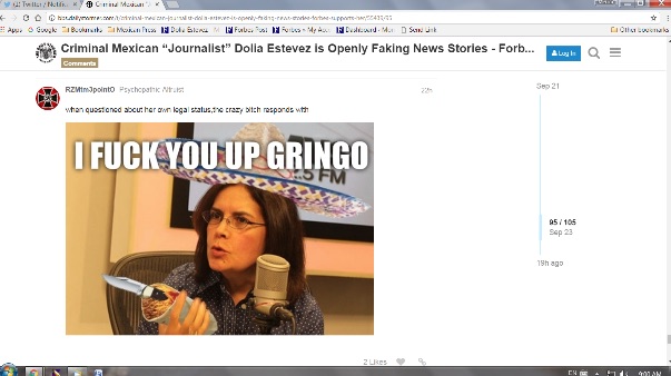 Durante 48 horas, mi cuenta de Twitter fue inundada de memes y textos misóginos. Me llamaron "puta horrible", "FEMINISTA", "lesbiana" y "activista". Me amenazaron de muerte. Lanzaron mensajes y difundieron memes pidiendo "destruirme". "NOW YOU DIE CUNT", (AHORA MUERES CUNT), decía un meme con la fotografía de un gato disparando una metralleta. (Cunt es la forma más despectiva de llamar a una mujer y es considerada una de las expresiones más ofensiva en inglés.) Otro tenía la imagen de un patrullero aplastando con su bota a Dora, el popular personaje animado de una exploradora de Disney que enseña español a los niños, con el mensaje, "GET OUT" (lárgate). También trataron de relacionarme con el actor Emilio Estevez, a quien tacharon de "marrano" (judío), epíteto que me aplicaron.
