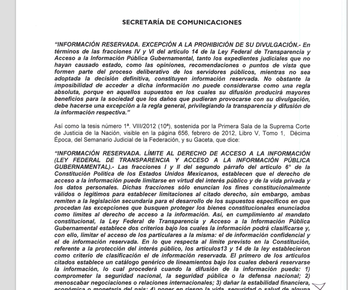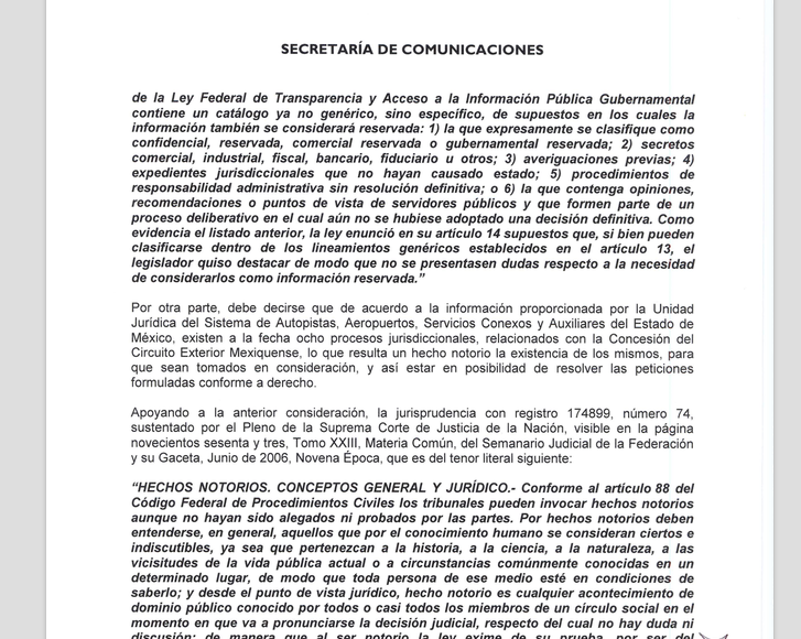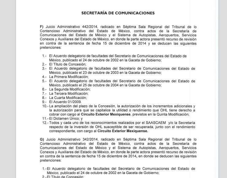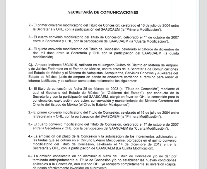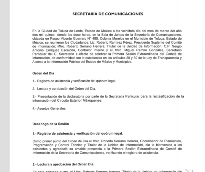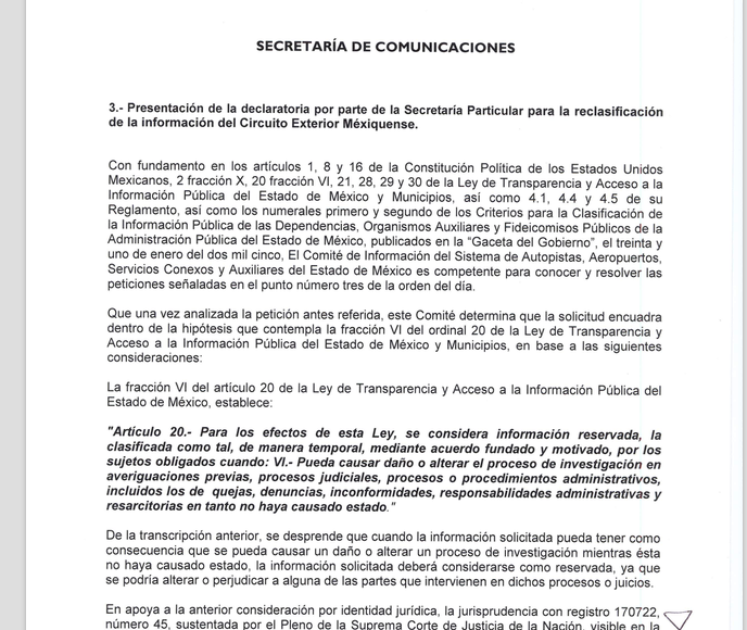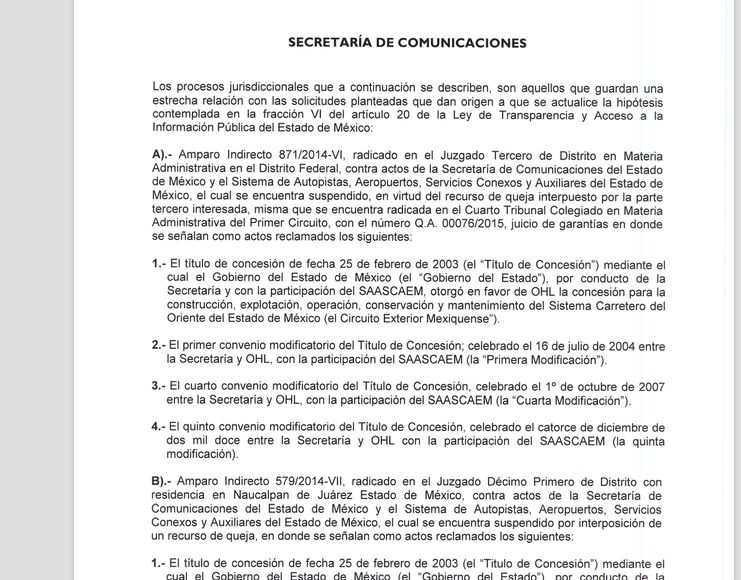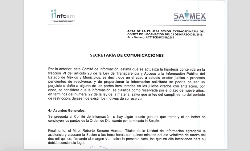 En su primera sesión extraordinaria del 23 de marzo de 2015, el Comité de Información de la Secretaría de Comunicaciones del Estado de México estimó: “ … De proporcionar la información solicitada (lo que concierne a OHL) se podría causar un perjuicio o daño a alguna de las partes involucradas en los juicios citados con antelación, por ende, se considera que la información se clasifica como reservada por el plazo de nueve años, en términos del numeral 22 de la ley de la materia, salvo que antes del cumplimiento del periodo de restricción, dejasen de existir los motivos de su reserva”.