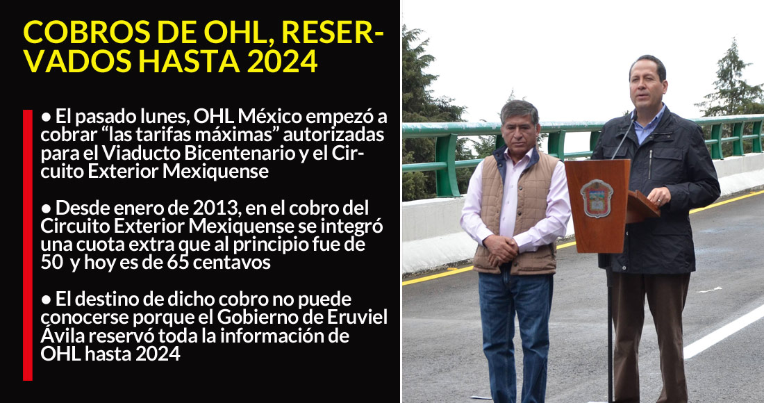 La información de OHL no se abrirá hasta 2024. Tanto el título de concesión como sus modificaciones y el SIVA fueron puestos bajo reserva  por el Gobierno de Ávila Villegas hasta esa fecha. En esta trama oculta, los personajes principales son Arturo Montiel Rojas, quien fue Gobernador del Estado de México (1999- 2005), Enrique Peña Nieto, Secretario de Finanzas y también Gobernador (2005-2011), Gerardo Ruiz Esparza, Secretario de Comunicaciones durante el mandato peñanietista en el Edomex y ahora con el mismo cargo a nivel federal, así como Eruviel Ávila Villegas, Gobernador saliente.
