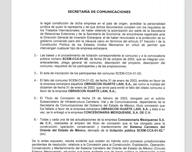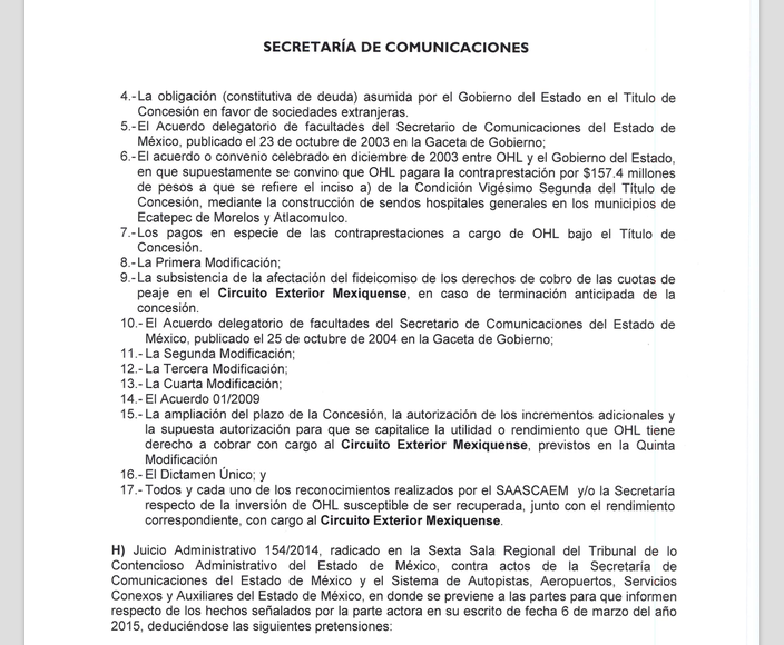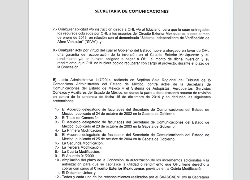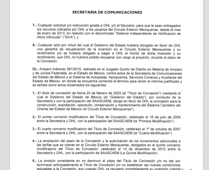 En el acta se lee que la Secretaría de Comunicaciones queda impedida para brindar información sobre cualquier solicitud y/o instrucción girada a OHL y/o fiduciario, para que le sean entregados los recursos cobrados por OHL a los usuarios del Circuito Exterior Mexiquense, desde el mes de enero de 2013, en relación con el denominado “Sistema Independiente de Verificación de Aforo Vehicular”.