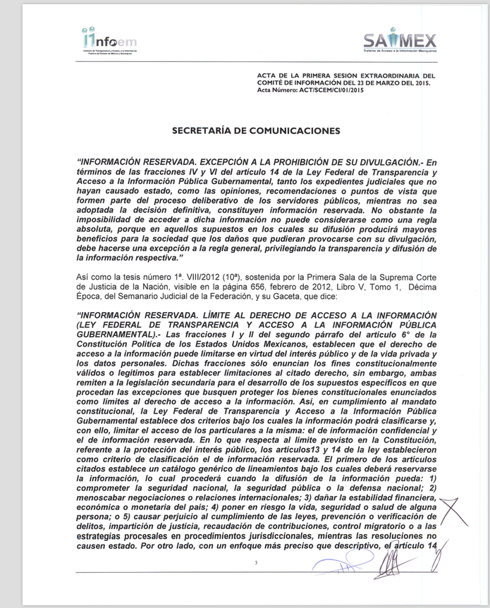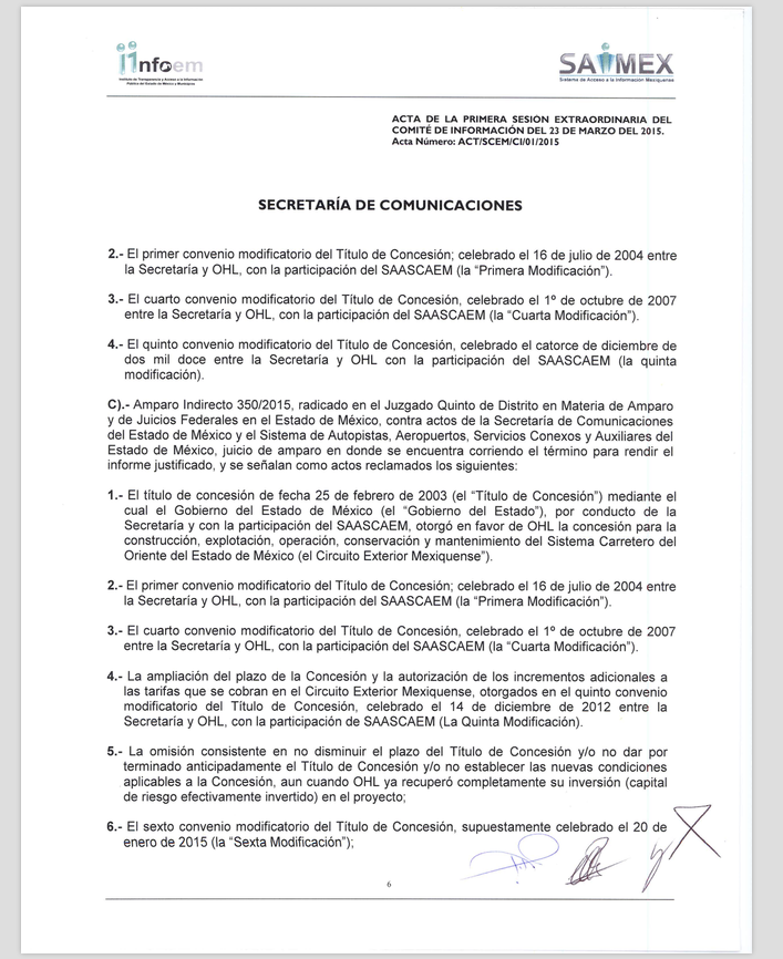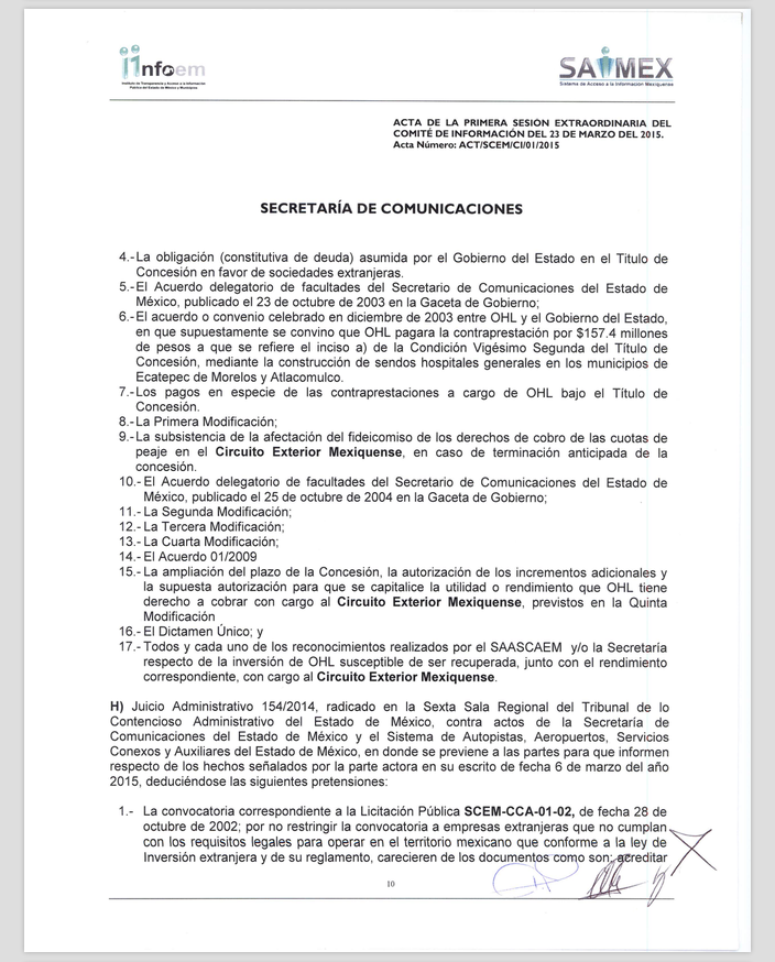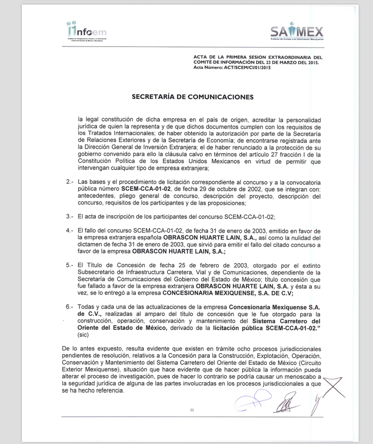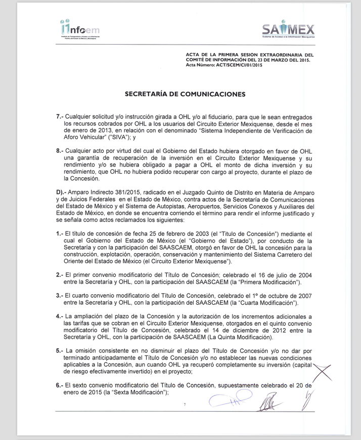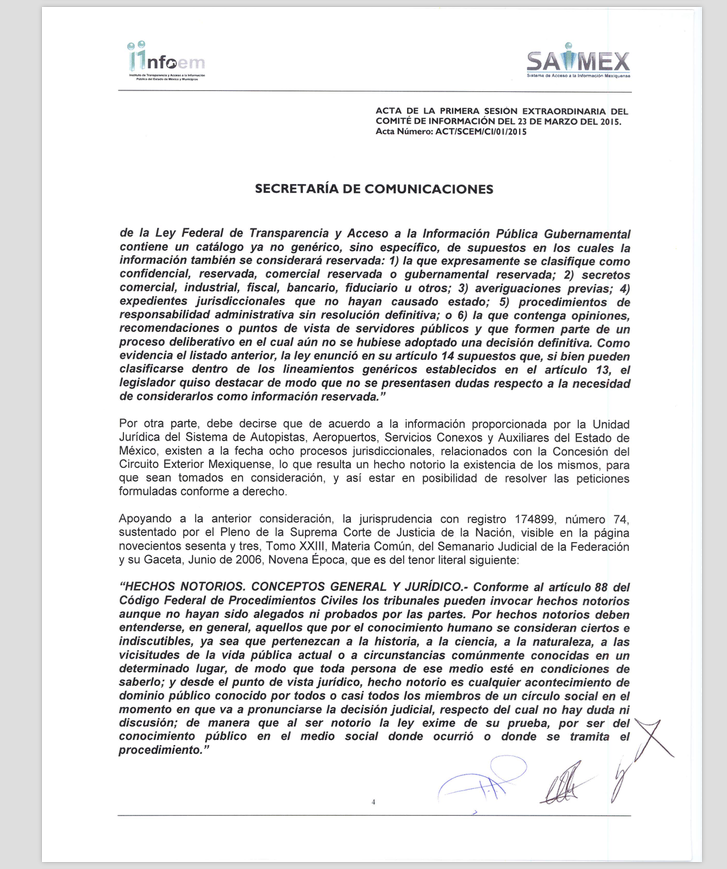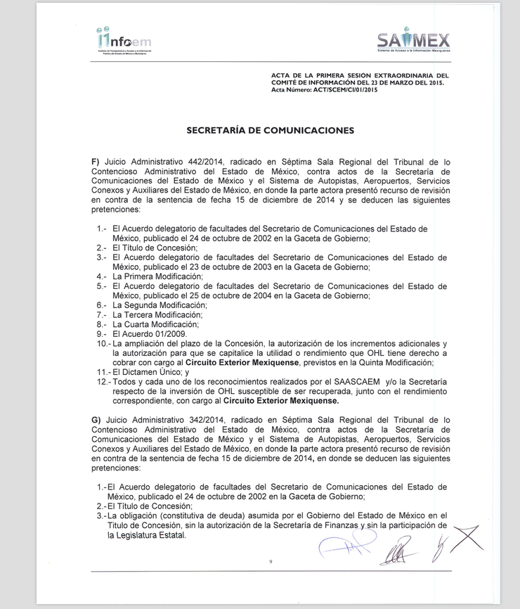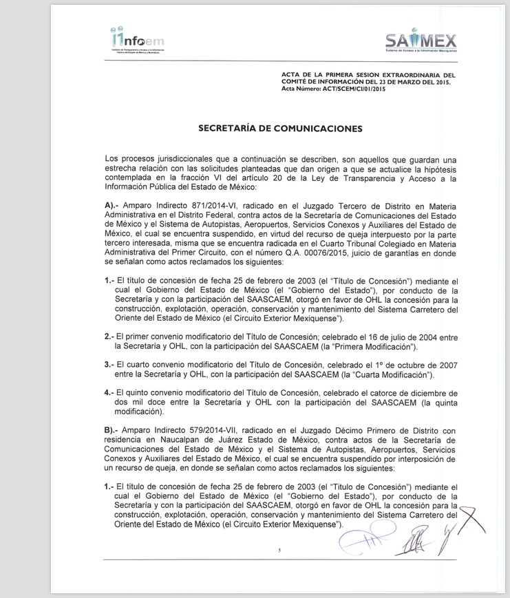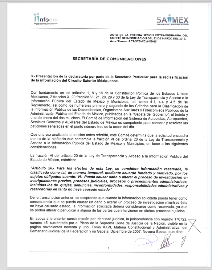 En su primera sesión extraordinaria del 23 de marzo de 2015, el Comité de Información de la Secretaría de Comunicaciones del Estado de México estimó: “ … De proporcionar la información solicitada (lo que concierne a OHL) se podría causar un perjuicio o daño a alguna de las partes involucradas en los juicios citados con antelación, por ende, se considera que la información se clasifica como reservada por el plazo de nueve años, en términos del numeral 22 de la ley de la materia, salvo que antes del cumplimiento del periodo de restricción, dejasen de existir los motivos de su reserva”.