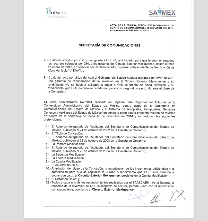 En el acta se lee que la Secretaría de Comunicaciones queda impedida para brindar información sobre cualquier solicitud y/o instrucción girada a OHL y/o fiduciario, para que le sean entregados los recursos cobrados por OHL a los usuarios del Circuito Exterior Mexiquense, desde el mes de enero de 2013, en relación con el denominado “Sistema Independiente de Verificación de Aforo Vehicular”.