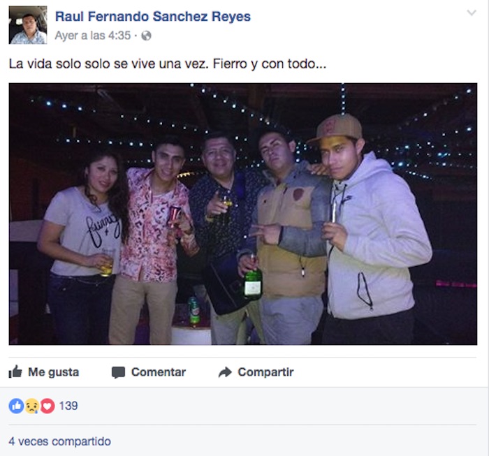 Antes de que se reportara su desaparición, Sánchez Reyes publicó en su cuenta de Facebook una imagen con un grupo de amigos y con la leyenda: “La vida solo se vive una vez. Fierro y con todo…”.