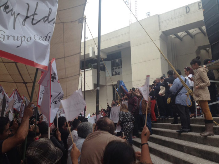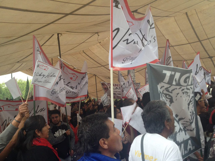 Los acarreados empezaron a llegar en grupos pequeños de unas 20 personas entradas las cuatro de la tarde. En desfile mujeres, hombres y niños ingresaron al área de la carpa recogiendo las balderolas de Grupo Cedros y de la Unión de Colonos Lázaro Cárdenas de Nazario Roberto Sánchez.