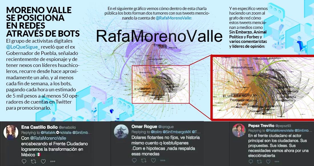 El ciberactivista resaltó que Moreno Valle es, de todos los aspirantes del Frente Ciudadano (Ricardo Anaya, Miguel Ángel Mancera y Margarita Zavala), el que más gasta en el uso de bots. Y no es una práctica reciente ni ocasional, "lleva un año usando bots, más o menos, y [desde entonces] cada fin de semana que realiza eventos públicos usa bots".