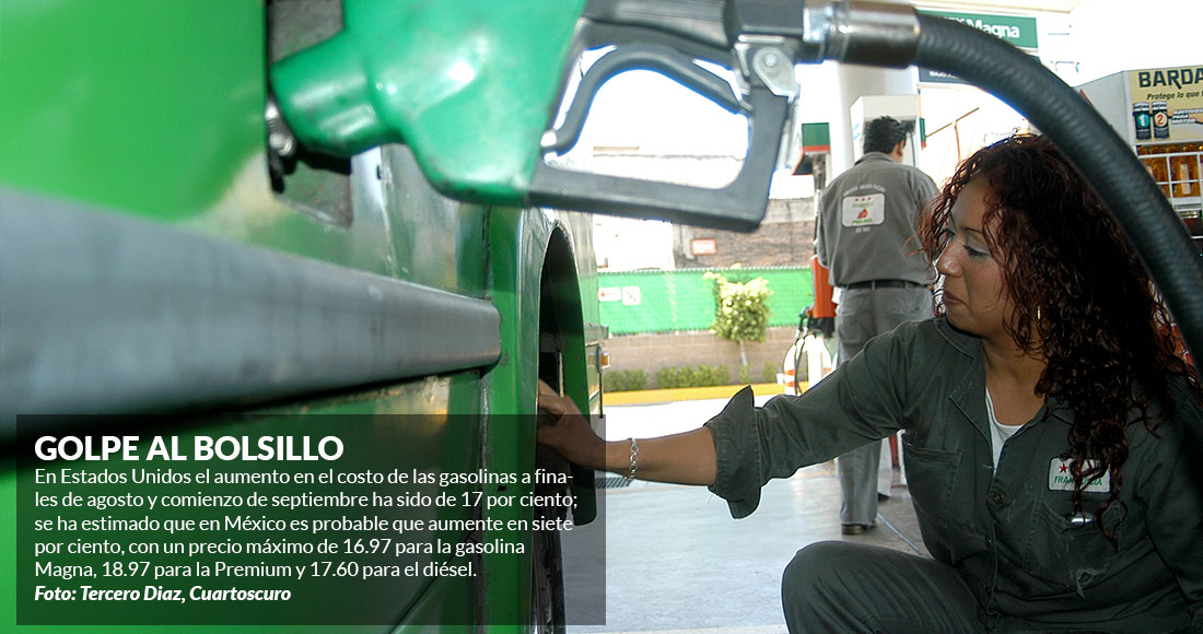 Daniel Alejandro Pacheco, de la Facultad de Economía, explicó que en Estados Unidos el aumento en el costo de las gasolinas a finales de agosto y comienzo de septiembre ha sido de 17 por ciento; se ha estimado que en México es probable que aumente en siete por ciento, con un precio máximo de 16.97 para la gasolina Magna, 18.97 para la Premium y 17.60 para el diésel.