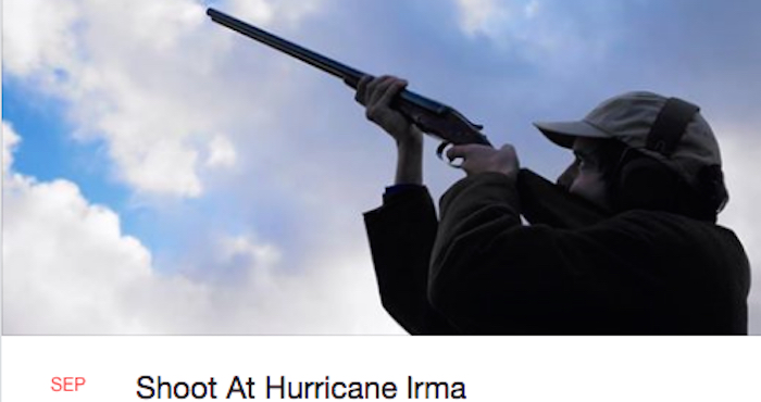 Ciudad de México, 10 de septiembre (RT/SinEmbargo).- "Mostremos a Irma que los primeros en disparar somos nosotros". Esta es la consigna que lanzan a los residentes de Florida (EU) dos usuarios de Facebook que han creado en esta red social un evento titulado 'Disparen contra el huracán Irma' que cuenta ya con más de 53 mil participantes.