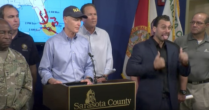 Así, mientras Scott realizaba advertencias y ofrecía detalles sobre ese fenómeno meteorológico, el hombre que traducía sus palabras al lenguaje de signos —cuya identidad se desconoce— realizaba gestos "extremadamente expresivos", como sacar la lengua o levantar las cejas, informa The Washington Examiner.