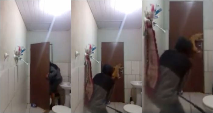 Finalmente, el roedor abandonó el lavamanos, pero el joven, al ver que el animal estaba afuera, gritó de miedo e intentó alejarse rápidamente, mientras su gato saltaba hacia la puerta del baño que el muchacho había cerrado para evitar que la rata escapara.