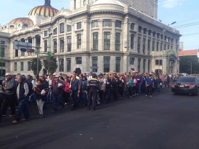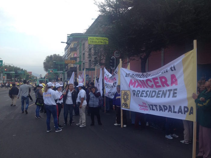 Con pancartas alusivas a "Mancera Presidente", los asistentes se instalaron por el Eje Central a la altura de Bellas Artes, sobre las banquetas y a la orilla de la avenida, lo que ha provocado que los transeúntes caminen sorteando los automóviles.