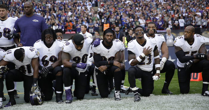 Londres, 24 de septiembre (AP) — Alrededor de una veintena de jugadores de la NFL, entre ellos el defensa de los Ravens de Baltimore Terrell Suggs y el running back de los Jaguars de Jacksonville Leonard Fournette, se hincaron el domingo durante la interpretación del himno nacional de Estados Unidos antes de que comenzara un partido entre sus equipos en el estadio Wembley de Londres.
