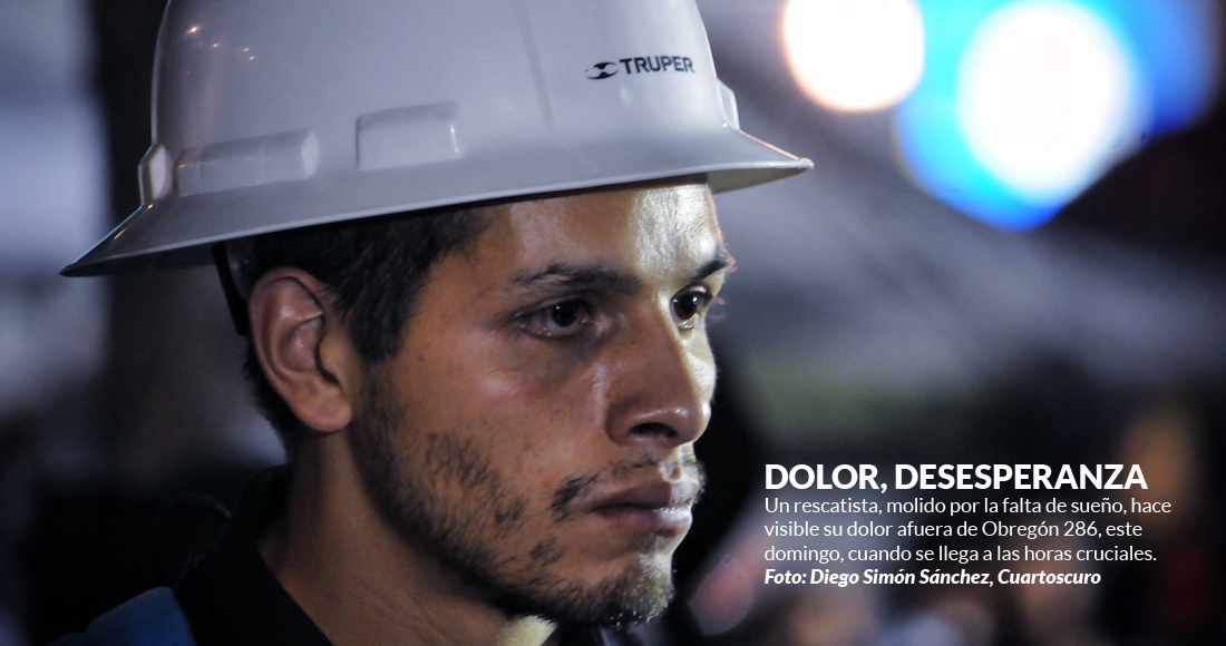 En el bloque de oficinas de siete alturas de la colonia Roma Norte que al colapsar atrapó a más de 40 personas, las familias pasaron el lunes sumidas una terrible desesperación ante la falta de noticias. Sólo les animaba saber que los equipos de rescate seguían trabajando pero el campamento era un cúmulo de tensión, ida y venida de voluntarios, y caras angustiadas.