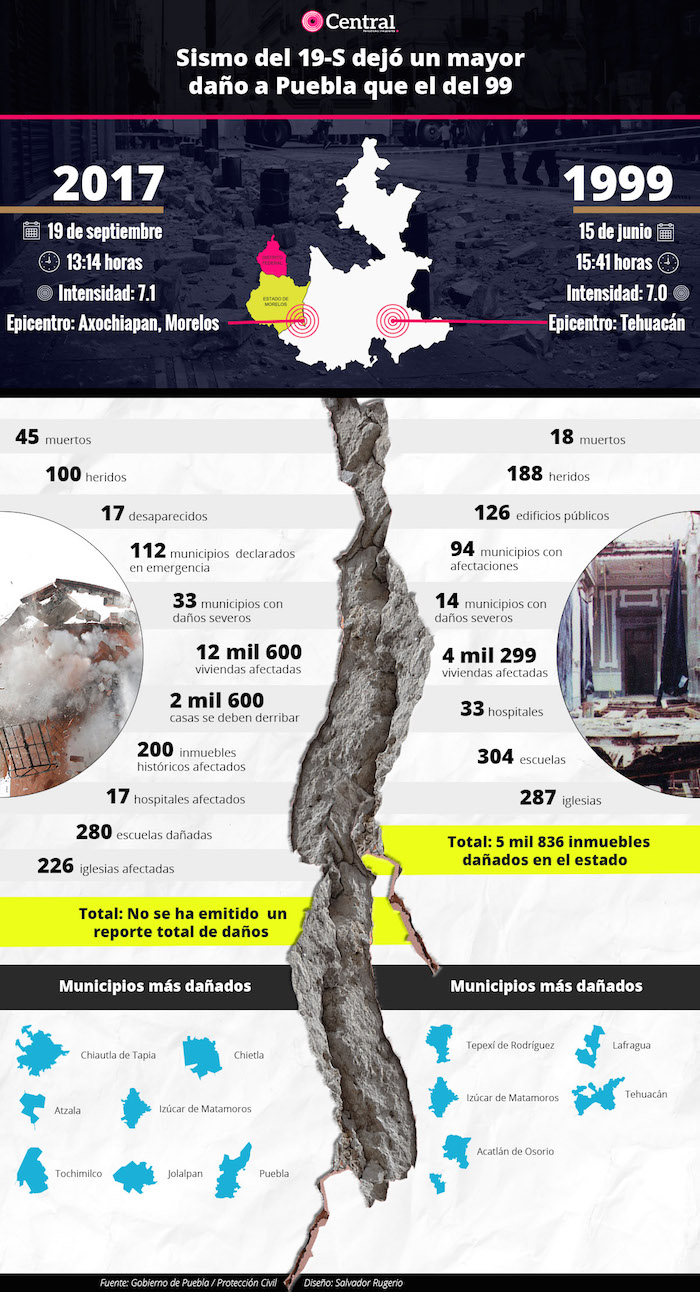 Puebla/Ciudad de México, 26 de septiembre (Periódico Central/SinEmbargo).- Transcurrieron 18 años para que los poblanos volvieran a sentir pánico por un terremoto y la naturaleza nos recordara lo frágil que son las casas, las iglesias, las escuelas, los hospitales… y la vida misma. El 15 de junio de 1999, Puebla se cimbró por un movimiento telúrico de gran intensidad. El saldo fue de 18 muertos en varios municipios. La catástrofe del 19 de septiembre de 2017 es tres veces mayor en víctimas. El corte final dice que la semana pasada murieron 45 personas.
