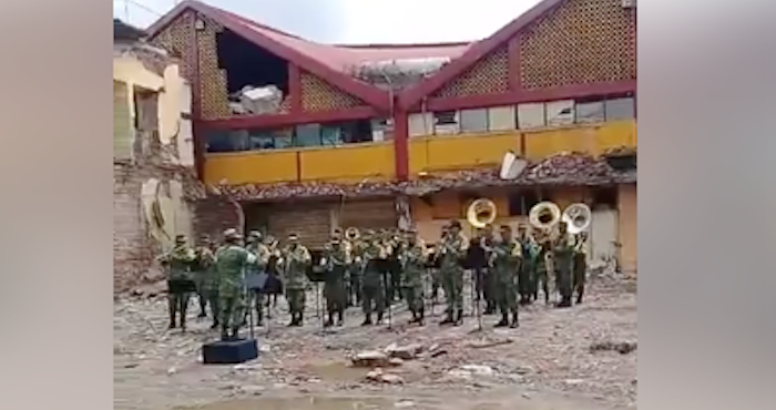 Ciudad de México, 27 de septiembre (SinEmbargo).- Un grupo militar interpretó la canción "La Sandunga", junto al Palacio Municipal de Juchitán en Oaxaca, mismo que fue derrumbado por el sismo de M- 8.2 el pasado 7 de septiembre.