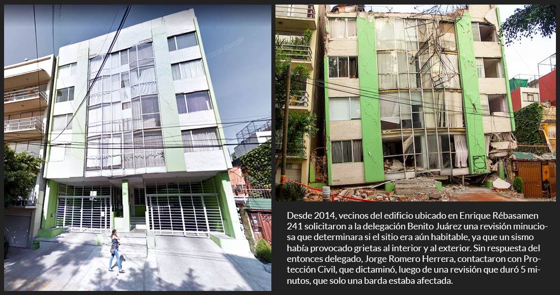 El problema es que esos mismos vecinos denunciaron las condiciones de su edificio desde 2014 ante la delegación Benito Juárez y ante su titular, Jorge Romero Herrera y no hubo respuesta; acudió Protección Civil, pero no hubo dictamen por escrito, solo le dijeron a una persona que todo estaba bien, salvo una barda que había que cambiar.
