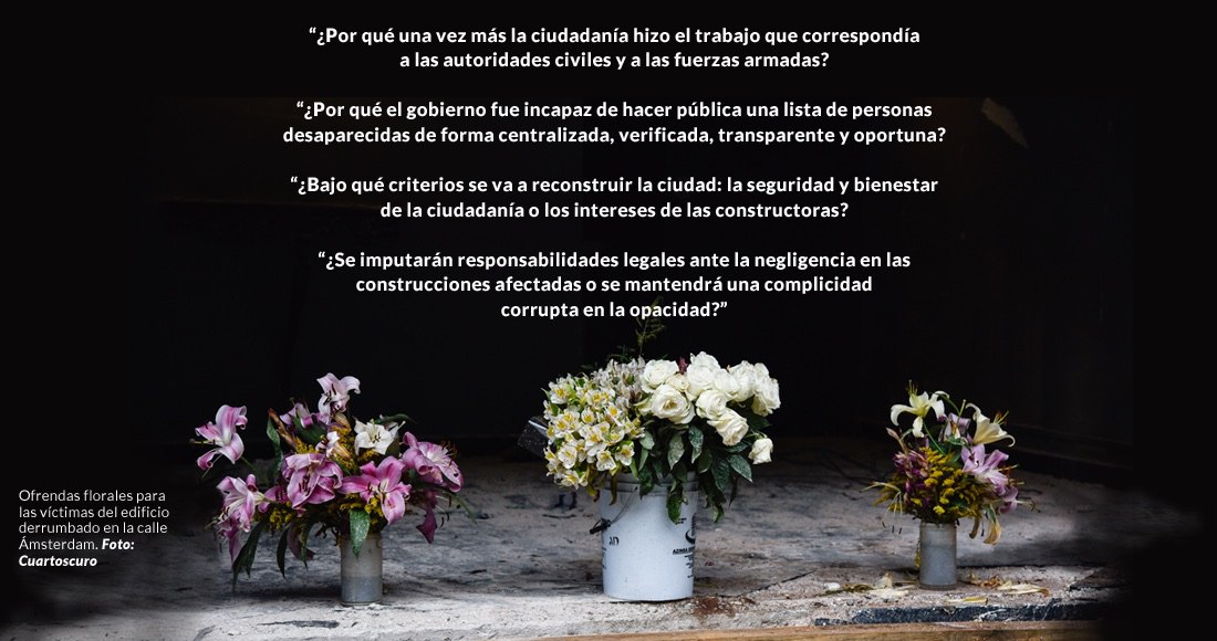 “¿Por qué el gobierno, en todos sus niveles, fue incapaz de establecer en tiempo real y de forma veraz una red de logística: acopio, almacenamiento, distribución y entrega de herramientas, materiales, equipo, medicamentos, víveres, mano de obra y especialistas en las zonas de riesgo y de derrumbe; así como de facilitar el trabajo de los equipos de rescate?