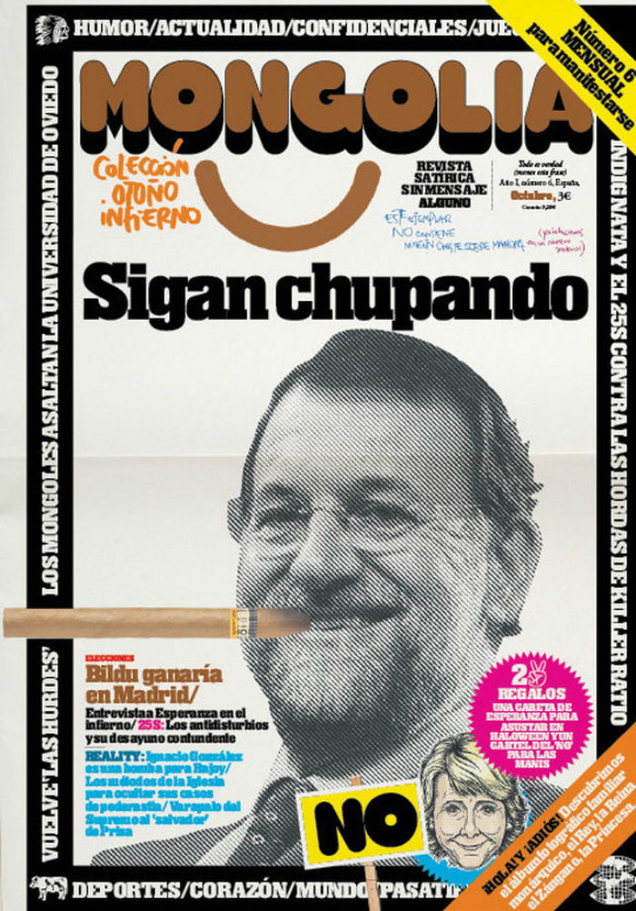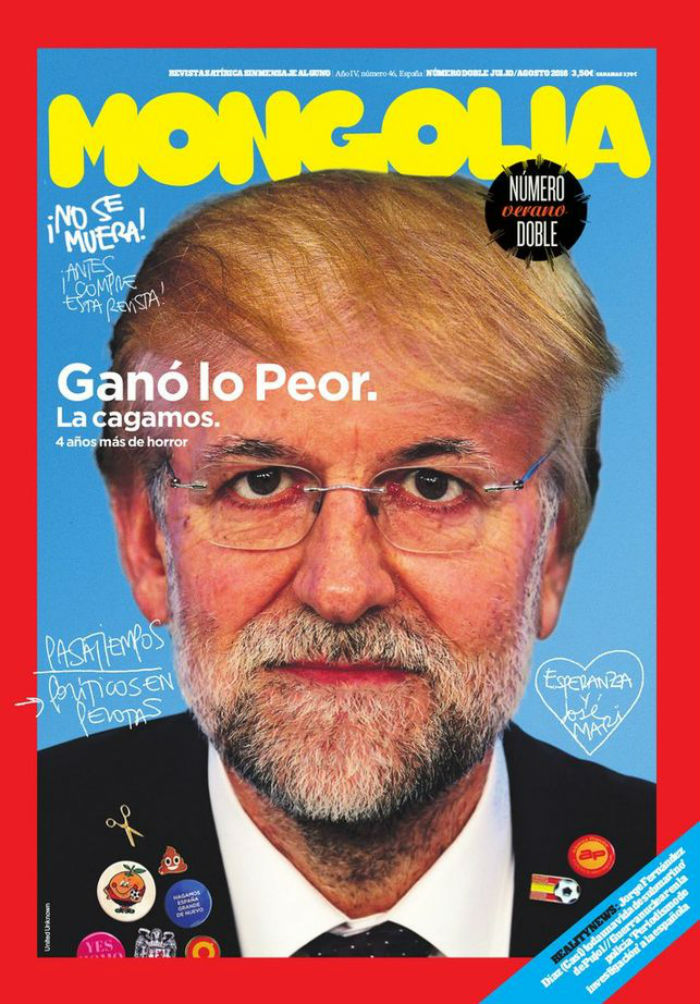 Ahora, Mongolia ha reunido sus 101 peores portadas en un libro puesto en marcha gracias al crowdfunding. Un gran número de ellas tienen a políticos españoles como protagonistas y a la corrupción como telón de fondo. Pero sin duda, Mariano Rajoy ha sido uno de los grandes artistas invitados de la publicación desde su nacimiento. Estas son algunas de las mejores/peores portadas dedicadas al presidente del Gobierno explicadas por sus creadores.
