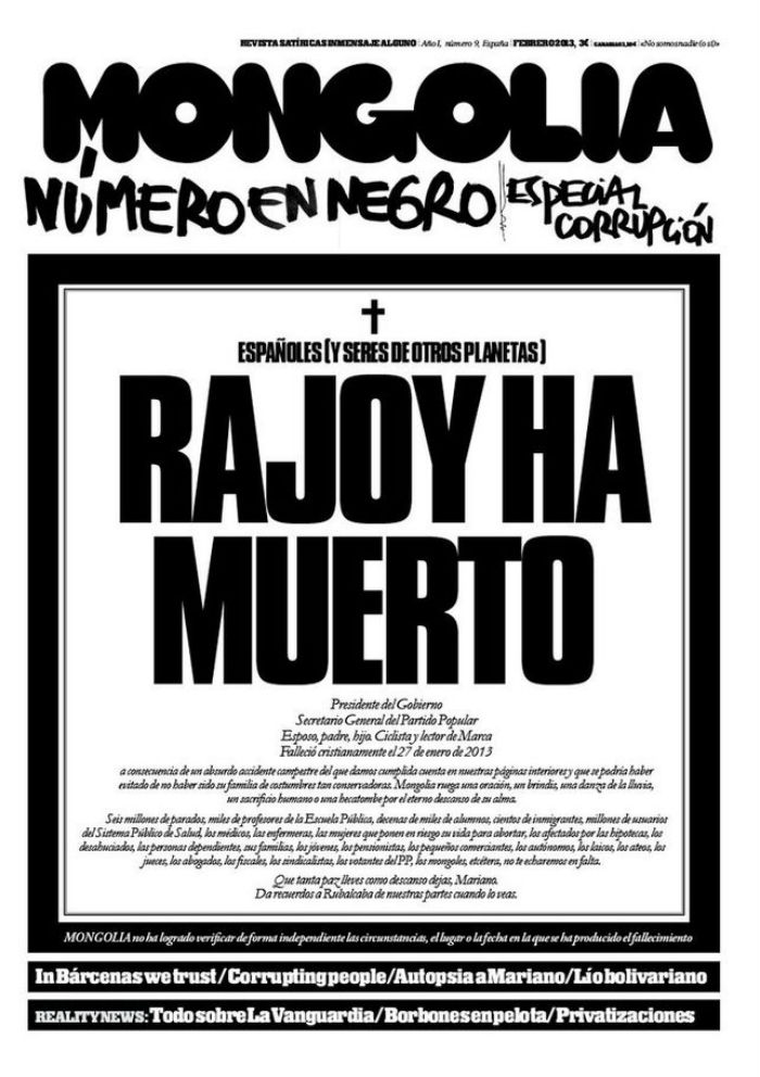 La portada con el fallecimiento de Rajoy fue muy celebrada en ambientes de ultraizquierda moderada porque vivían en el mismo engaño que nosotros. Incluso organizamos velatorios y colgamos versiones reducidas por los portales para anunciar el deceso. Lo que no sabíamos es que el Presidente seguía vivito y se reía de nosotros con un buen puro en la boca y un aliento que no lo querría Javier Cárdenas para sí".