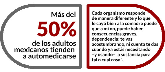 Vélez expone que más del 50 por ciento de los adultos mexicanos tienden a automedicarse, incluidos los médicos, “una de las principales causas es la comodidad, es muy común preguntarle a la vecina, a la comadre, uno quiere evitar colas, para qué ir al doctor si es sólo un dolor de cabeza o diarrea y lo que me recomienda el amigo, mi familia o el vecino es suficiente”. La mayoría desconoce que al ejercer dicha práctica puede provocarse una intoxicación leve o severa: cualquier medicamento puede generar una reacción adversa en el organismo: “Hay personas que incluso pueden sufrir un choque anafiláctico y no lo saben hasta que ocurre. Cada organismo responde de manera diferente y lo que le cayó bien a la comadre puede que a mí no, puede haber consecuencias graves, dependencia; te vas acostumbrando, ni cuenta te das cuando ya estás necesitando –y usando– la sustancia para tal o cual cosa”.