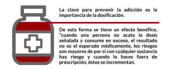 La clave para prevenir la adicción, señala Vélez “es la importancia de la dosificación”, algo que parece obvio, pero no siempre se lleva a cabo. De esta forma se tiene un efecto benéfico, “cuando una persona no acata la dosis señalada y consume en exceso, el resultado no es el esperado médicamente, los riesgos son mayores de por sí con cualquier sustancia hay riesgo y cuando lo haces fuera de prescripción, éstos se incrementan”, añade.