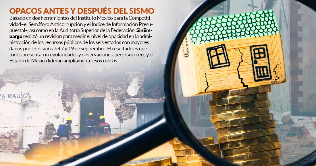 Los gobernadores de los estados afectados por los sismos del 7 y 19 de septiembre se mueven intensamente por las zonas afectadas entregando víveres, materiales para la construcción y reparación de viviendas, abriendo escuelas y hospitales supuestamente rehabilitados, presumiendo donaciones e incluso pidiendo más deuda a sus congresos... todo, sin la supervisión ciudadana y pese al llamado de los grupos civiles de que el dinero público para la reconstrucción se transparente y se rindan cuentas claras.