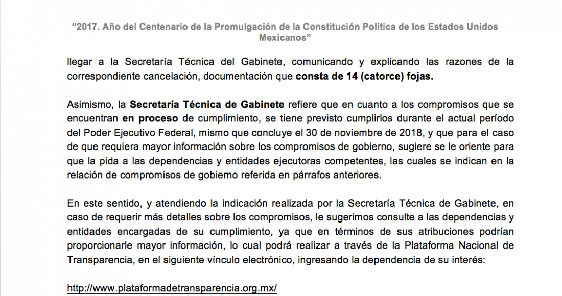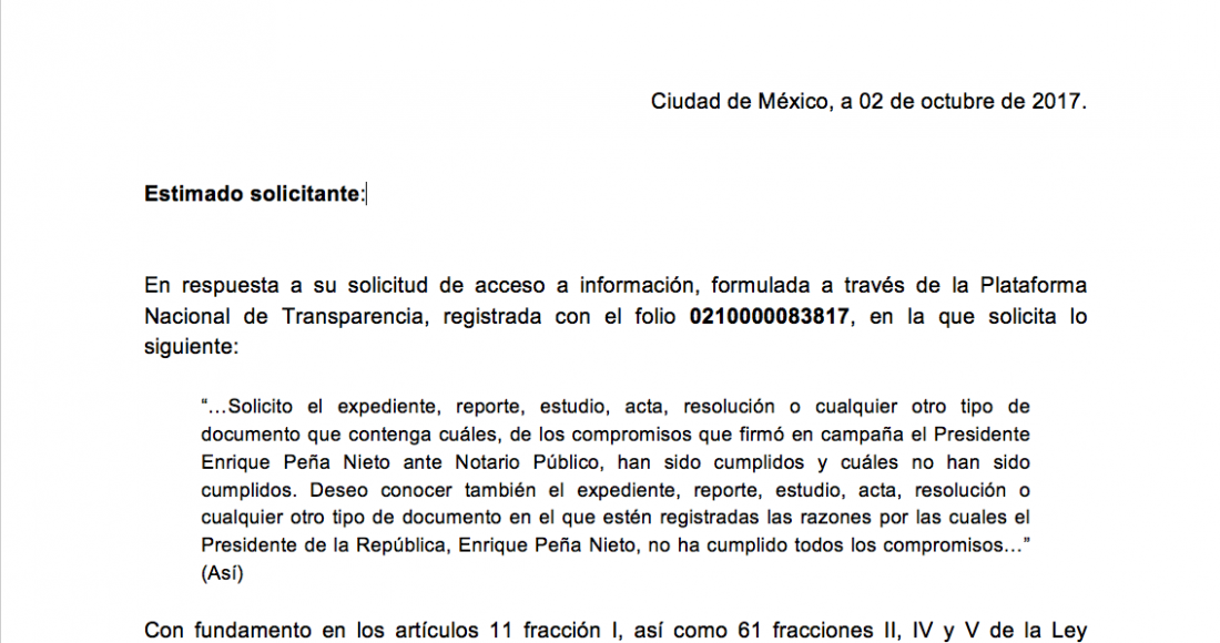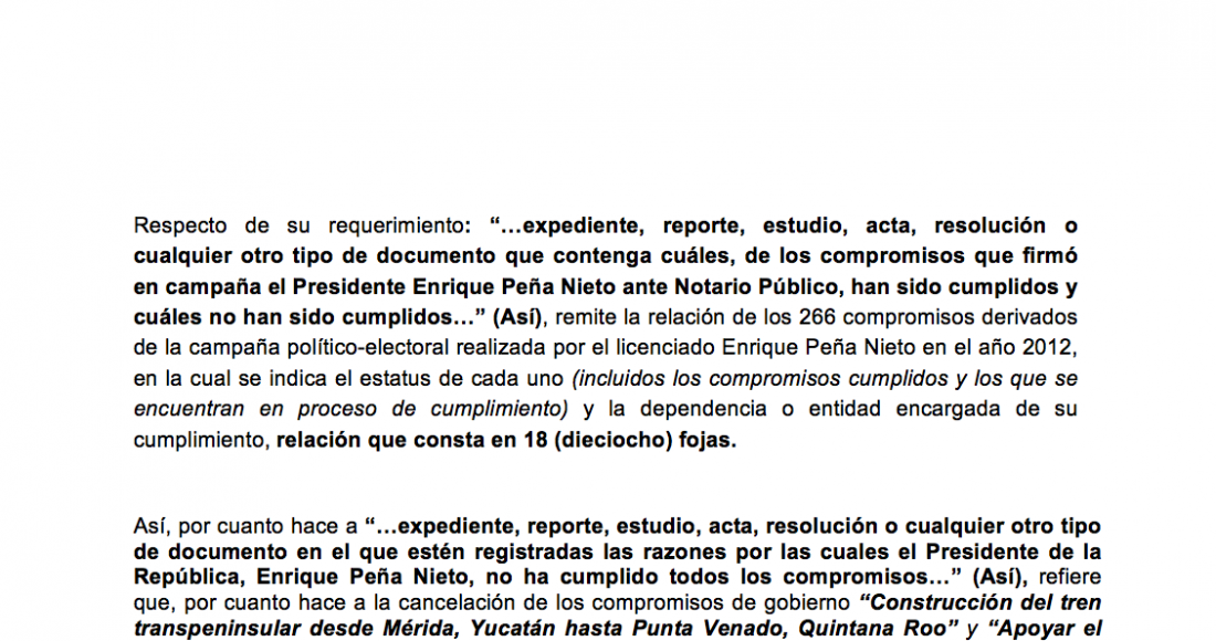 #DatosCerrados | ¿Quiere usted saber cuáles de los 266 compromisos firmados ante Notario Público en campaña reconoce el Presidente Enrique Peña no haber cumplido? ¿Desea usted conocer por qué los ha dejado pendientes? Pague 598 pesos a la Presidencia de la República y entonces, se le enviará un documento con las promesas y su respectivo estatus. Eso le respondió a este medio Los Pinos mediante una solicitud de información.