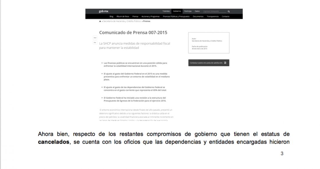Ejemplo de la perturbación económica sobre los compromisos es la cancelación del 243 que implicaba la construcción del tren transpeninsular desde Mérida, Yucatán, hasta Puerto Venado, Quintana Roo y el tren rápido Querétaro-Ciudad de México.