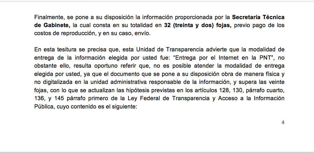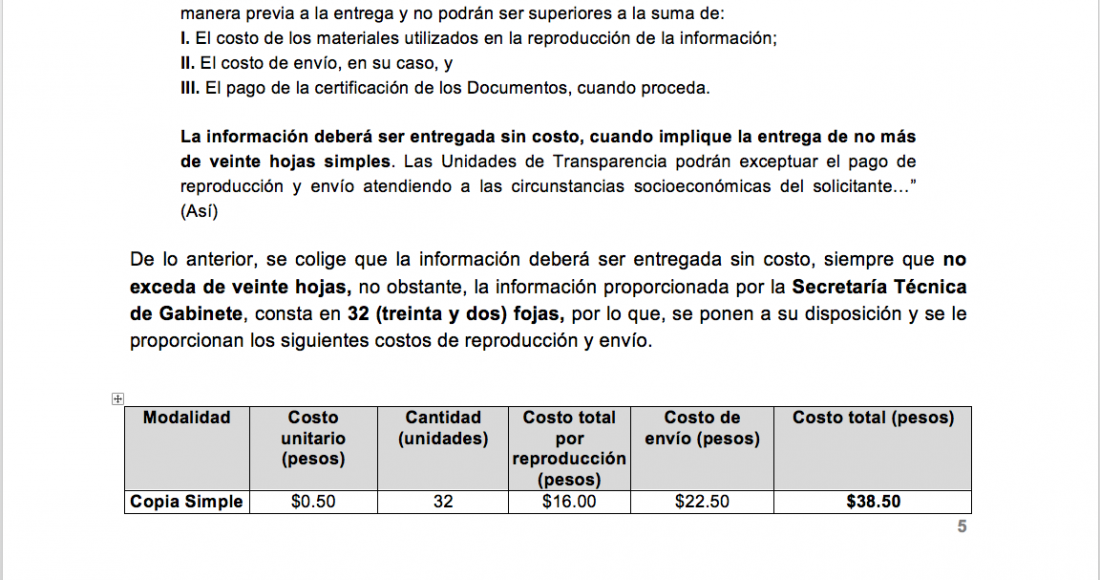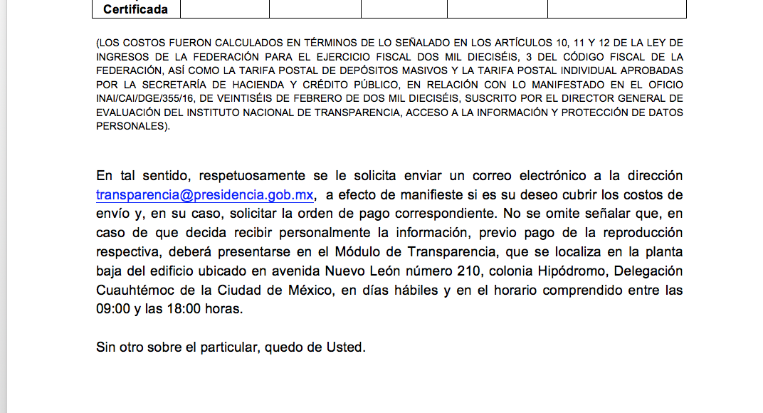 Pero ese ciudadano deseoso de Transparencia no tendrá el documento de manera gratuita. Para entregárselo, Los Pinos se atiene a la Ley Federal de Transparencia y Acceso a la Información. Así que le cobrará 598.50 pesos por un cúmulo de 32 hojas. Cada hoja cuesta 50 centavos; su reproducción, 16 pesos. Además por el envío deberá pagar 16 pesos.