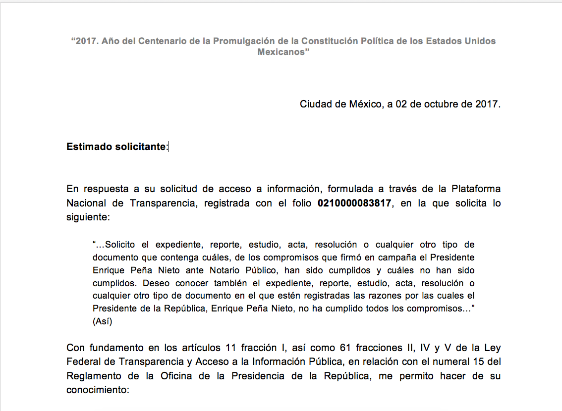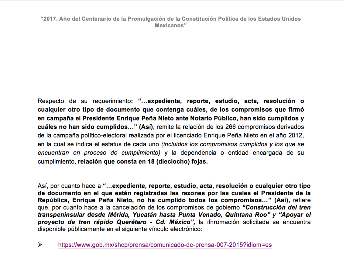 #DatosCerrados | ¿Quiere usted saber cuáles de los 266 compromisos firmados ante Notario Público en campaña reconoce el Presidente Enrique Peña no haber cumplido? ¿Desea usted conocer por qué los ha dejado pendientes? Pague 598 pesos a la Presidencia de la República y entonces, se le enviará un documento con las promesas y su respectivo estatus. Eso le respondió a este medio Los Pinos mediante una solicitud de información.
