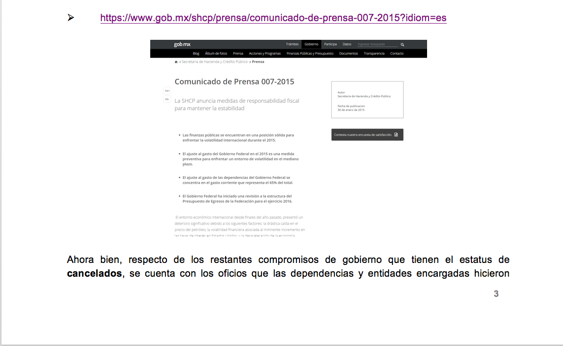 Ejemplo de la perturbación económica sobre los compromisos es la cancelación del 243 que implicaba la construcción del tren transpeninsular desde Mérida, Yucatán, hasta Puerto Venado, Quintana Roo y el tren rápido Querétaro-Ciudad de México.