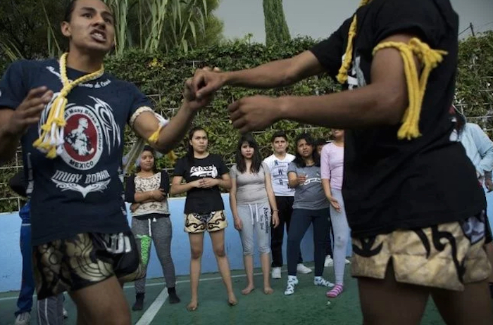 En una clase, las alumnas daban puñetazos y patadas en una cancha de fútbol cubierta _ y hablaban sobre aprender a tener miedo desde una edad muy temprana.
