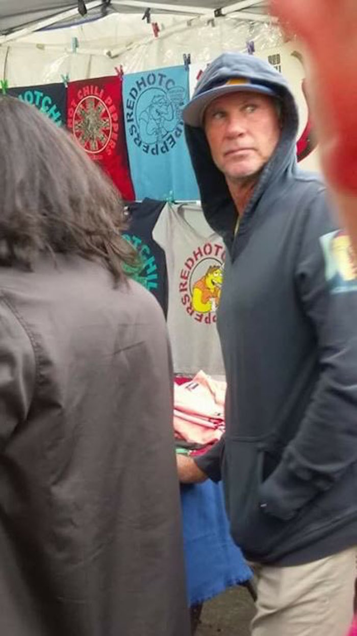 El baterista de Red Hot Chili Peppers, Chad Smith, recorre puestos de playeras previo al concierto