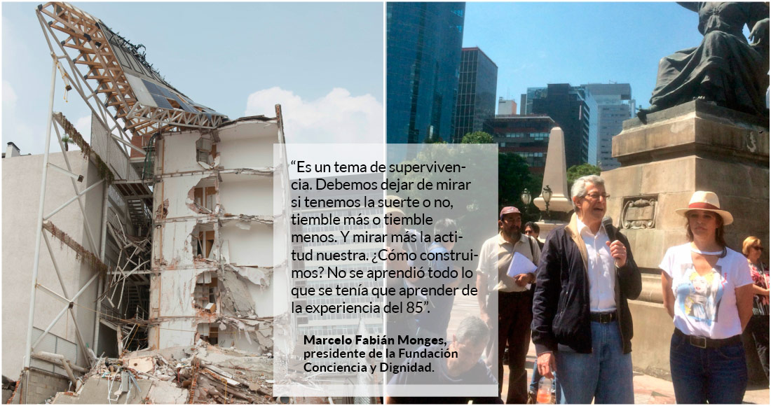 “Es un tema de supervivencia. Debemos dejar de mirar si tenemos la suerte o no, tiemble más o tiemble menos. Y mirar más la actitud nuestra. ¿Cómo construimos? No se aprendió todo lo que se tenía que aprender de la experiencia del 85’’, dijo Marcelo Fabián Monges, presidente de la Fundación, durante la convocatoria a la toma pacífica del Ángel de este domingo 14 de octubre.