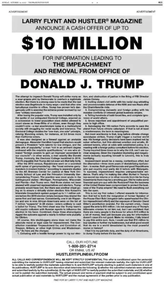 Flynt ofrece “hasta $10 millones de dólares” a cualquier persona que proporcione información que conduzca al juicio político y eventual destitución del Presidente Trump.