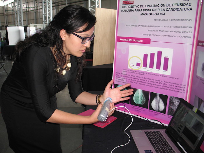 El otro desarrollo presentado por el CFATA, con la colaboración de la Universidad del Valle de México (UVM), campus Querétaro, y la Universidad Autónoma de Querétaro (UAQ), es un dispositivo de evaluación de densidad mamaria, que tiene la finalidad de discernir la candidatura a una mastografía, por parte de las estudiantes Sarasuadi Guizar Naranjo e Ilse Ivette Reyes Bautista.