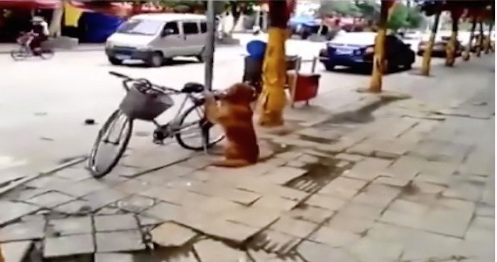 El perro cuida la bicicleta en la calle mientras su dueño está ausente sorprendió a los usuarios de las redes sociales.