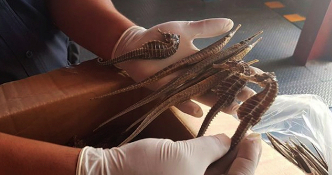 Al realizar el conteo del producto se obtuvieron 3 kilos 325 gramos de los cuales 260 son piezas de peces pipa y 450 piezas de caballito de mar color café distribuidas en dos bolsas de plástico provenientes de Campeche y con destino a Nayarit.