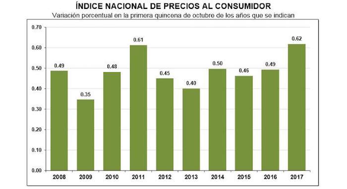 La índice Nacional de precios al Consumidor registró un incremento de 0.62 por ciento, así como una tasa de inflación anual de 6.30 por ciento en la primera quincena de octubre. La cifra es la más alta desde 2011 cuando fue de 0.61 por ciento, de acuerdo con datos del Inegi.
