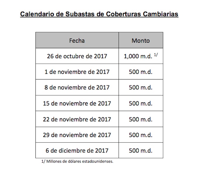 Ciudad de México, 25 de octubre (SinEmbargo).– El Banco de México (Banxico) aumentará el monto de coberturas cambiarías liquidables por diferencia en moneda nacional, de cara a episodios de volatilidad en los mercados asociados primordialmente a la incertidumbre en torno a la renegociación del Tratado de Libre Comercio de América del Norte (TLCAN).
