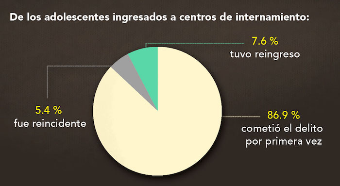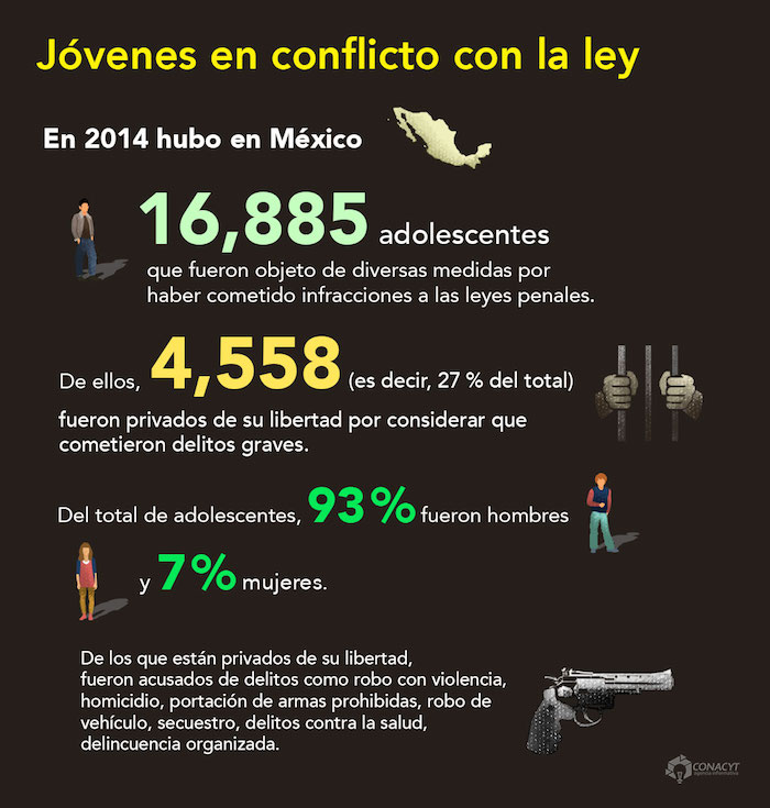 En 2014, 16 mil 885 adolescentes fueron objeto de alguna medida por infringir las leyes penales en México; de ellos, solo cuatro mil 558 (27 por ciento) estuvieron privados de su libertad tras haber cometido delitos graves.
