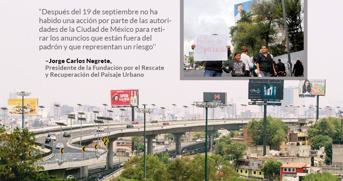 La Fundación por el Rescate y Recuperación del Paisaje Urbano acusa que tras el sismo del 19 de septiembre "no ha habido una acción por parte del Gobierno de la Ciudad de México para retirar los anuncios que están fuera del padrón y que representan un riesgo".