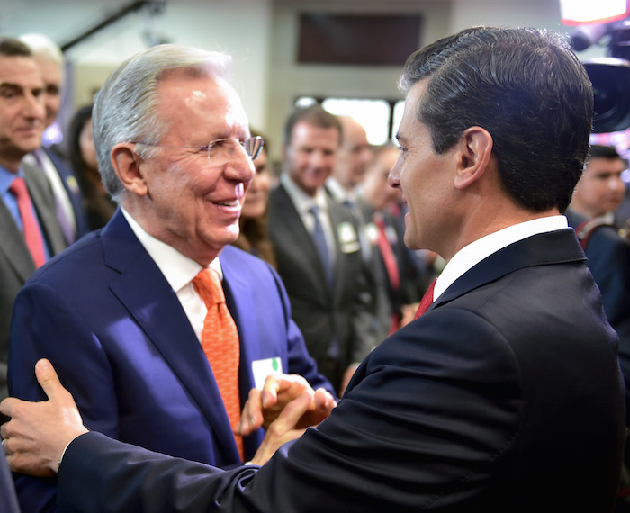 El Presidente Enrique Peña Nieto saluda al periodista Joaquín López-Dóriga, quien por años fue el rostro de las noticias de Televisa. Foto: Cuartoscuro