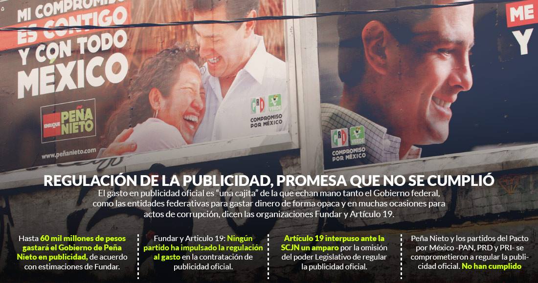 Pasaron ya cinco años de que Peña Nieto prometió regular la publicidad oficial y lejos de ver los resultados, hoy se sabe que el dinero destinado a medios de comunicación ha incrementado y no se han respetado los límites que le ha marcado el Presupuesto de Egresos de la Federación.