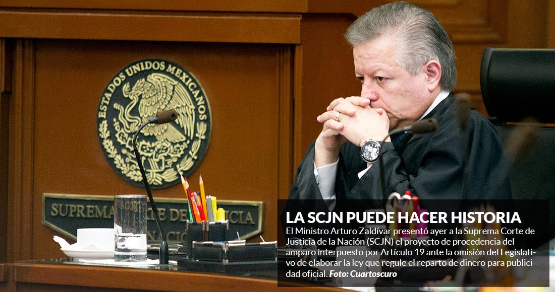 La SCJN presentó el proyecto de sentencia a favor de Artículo 19, en la que reconoce la omisión del Congreso de la Unión de elaborar una Ley que regule la asignación de la publicidad oficial.