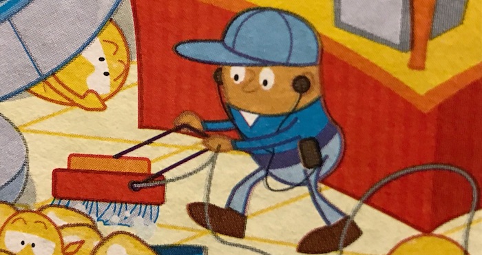 El dibujo en cuestión es una representación aparentemente inocente de un trabajador de limpieza el cual está tristemente haciendo su trabajo mientras todos a su alrededor jugando.