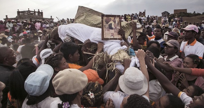 Durante el 'famadihana' los familiares sacan a sus difuntos de las tumbas, los envuelven en un nuevo sudario, los levantan en brazos y bailan alrededor de la tumba acompañados por música en vivo. Al cabo de unas horas vuelven a depositar a los muertos dentro de su sepultura.